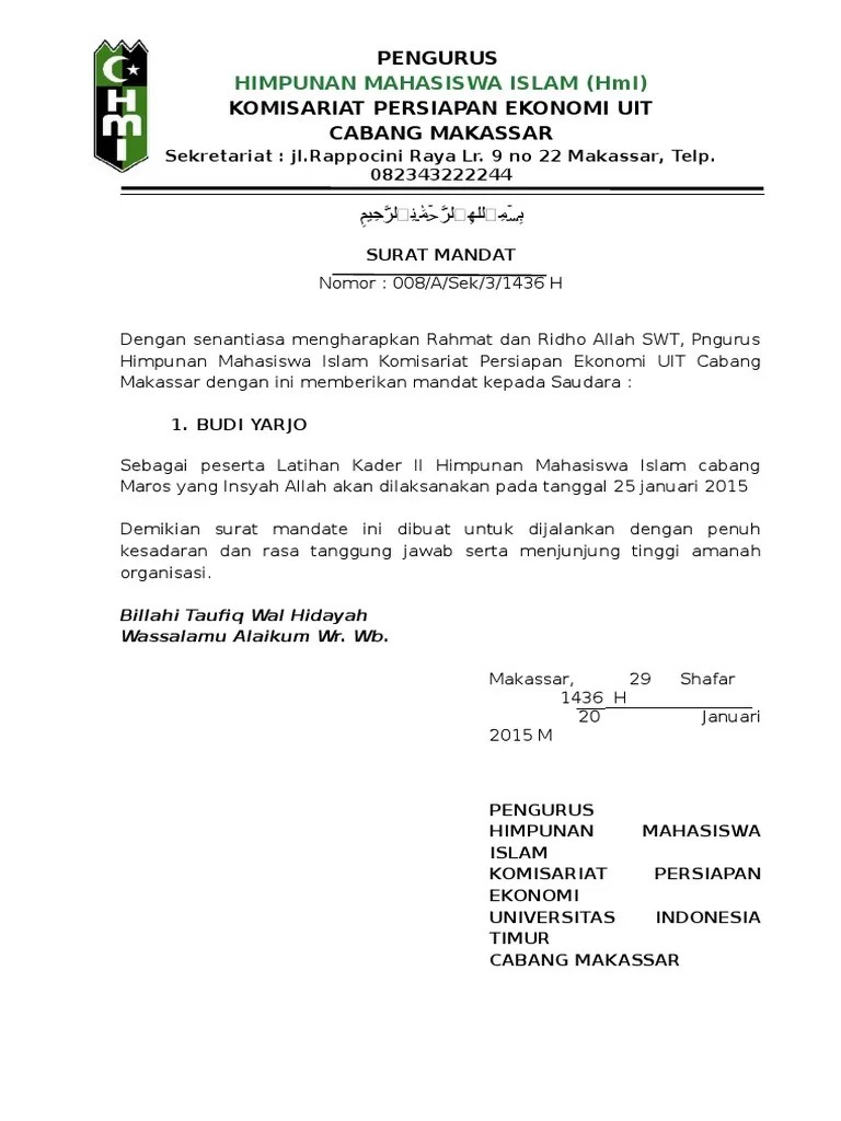 Badan pengelola latihan bpl himpunan mahasiswa islam hmi cabang. Surat mandat hmi komisariat stt nusa putra . Surat delegasi dari hmi cabang yogyakarta. Demikian s!rat mandat ini di)!at !nt!k di5alankan se)agaimana mestin*a6 atas. Contoh surat mandat hmi doylc asia.